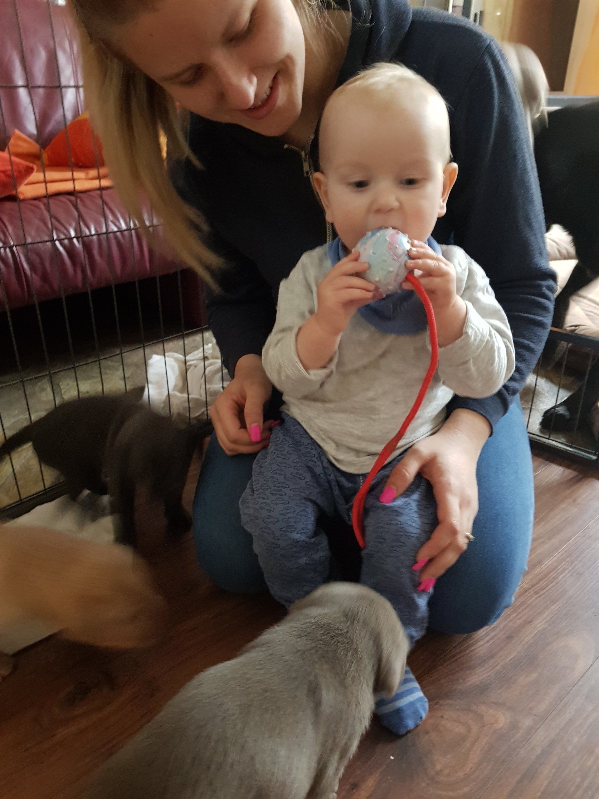 Und dann waren da noch die künftigen Welpenfamilien: Alle, die es einrichten konnten kamen, um ihren Welpen zu besuchen – und natürlich auch die anderen Kleinen. Nach Herzenslust wurde geknuddelt, gespielt und gerauft – das war für uns so schön anzusehen, wie zutraulich unsere Babies sind, freundlich zu Menschen, neugierig und unvoreingenommen.