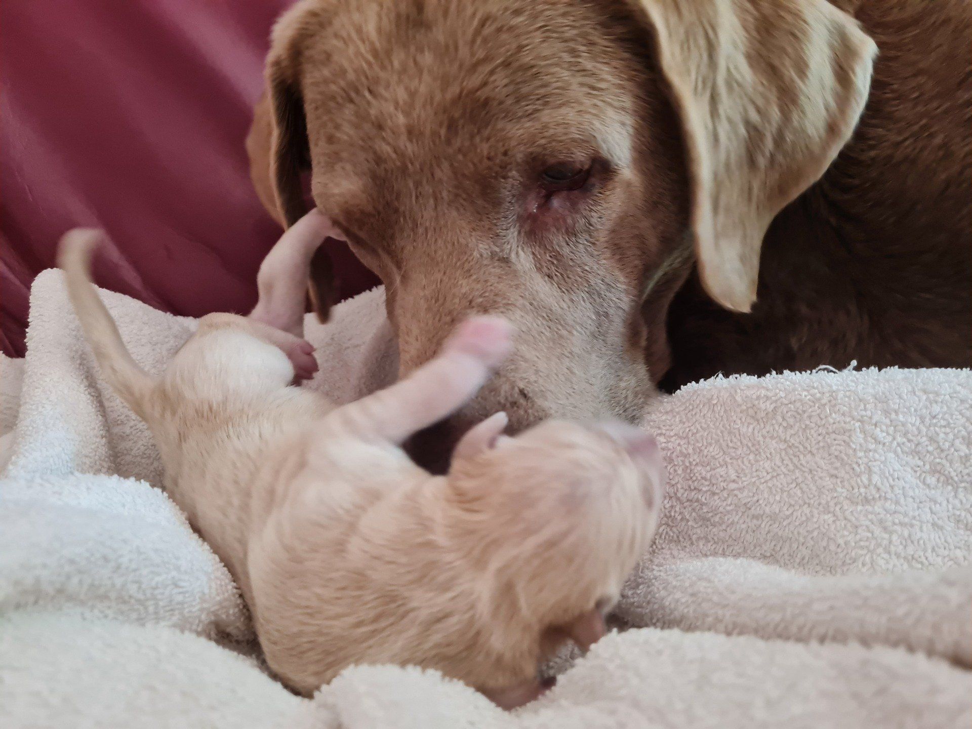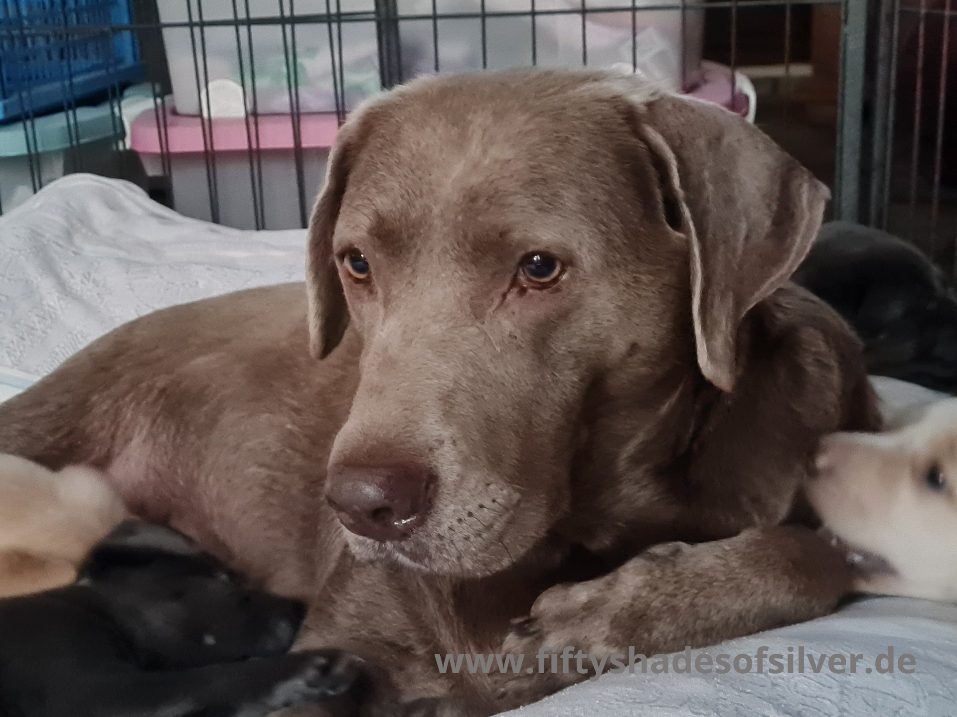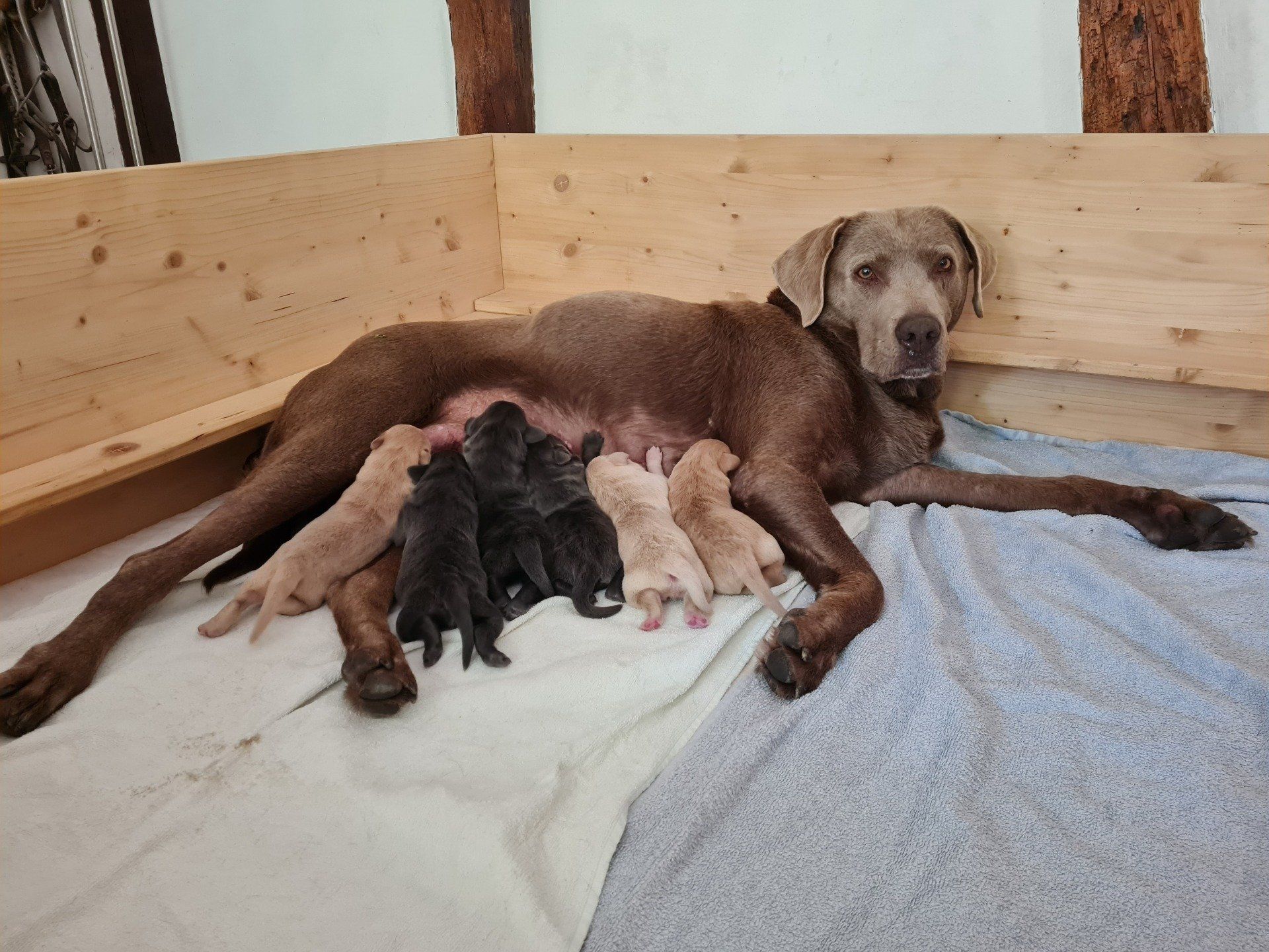 Uns bleiben für den Moment die niederen Aufgaben wie Futter für die schwer beanspruchte Hundemama zurecht machen, das Wurflager frisch machen, Kochwäsche waschen und die Kleinen täglich wiegen. Natürlich dürfen wir auch streicheln: Die Mama und die Babys 😊