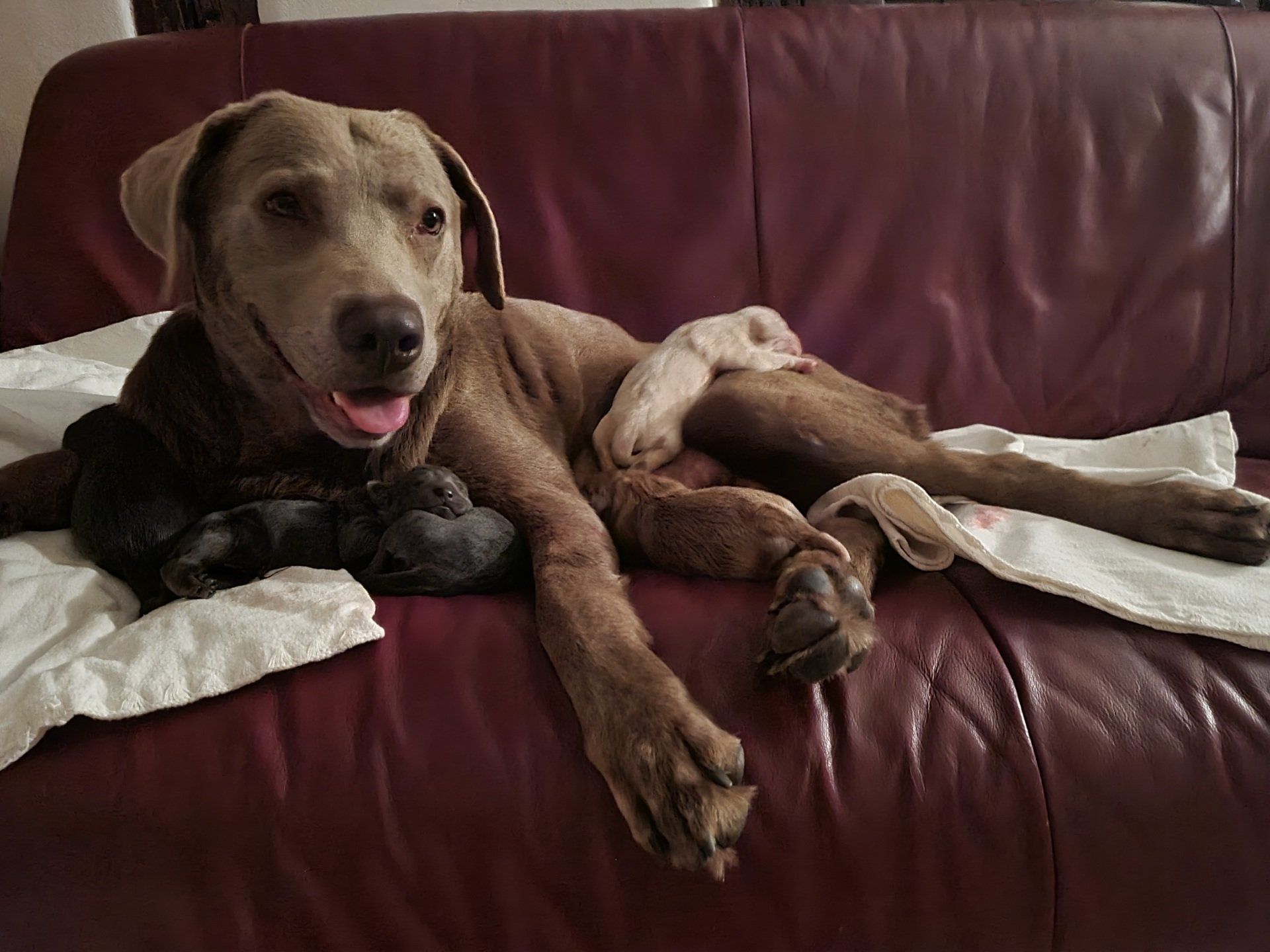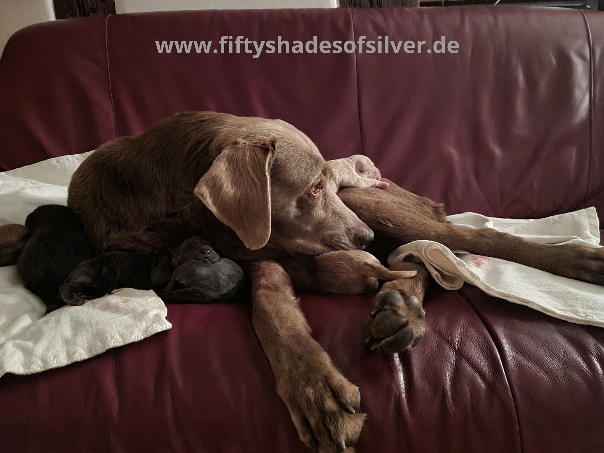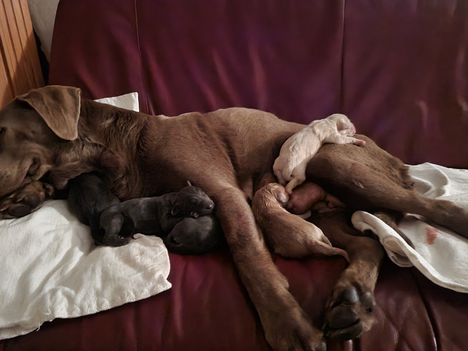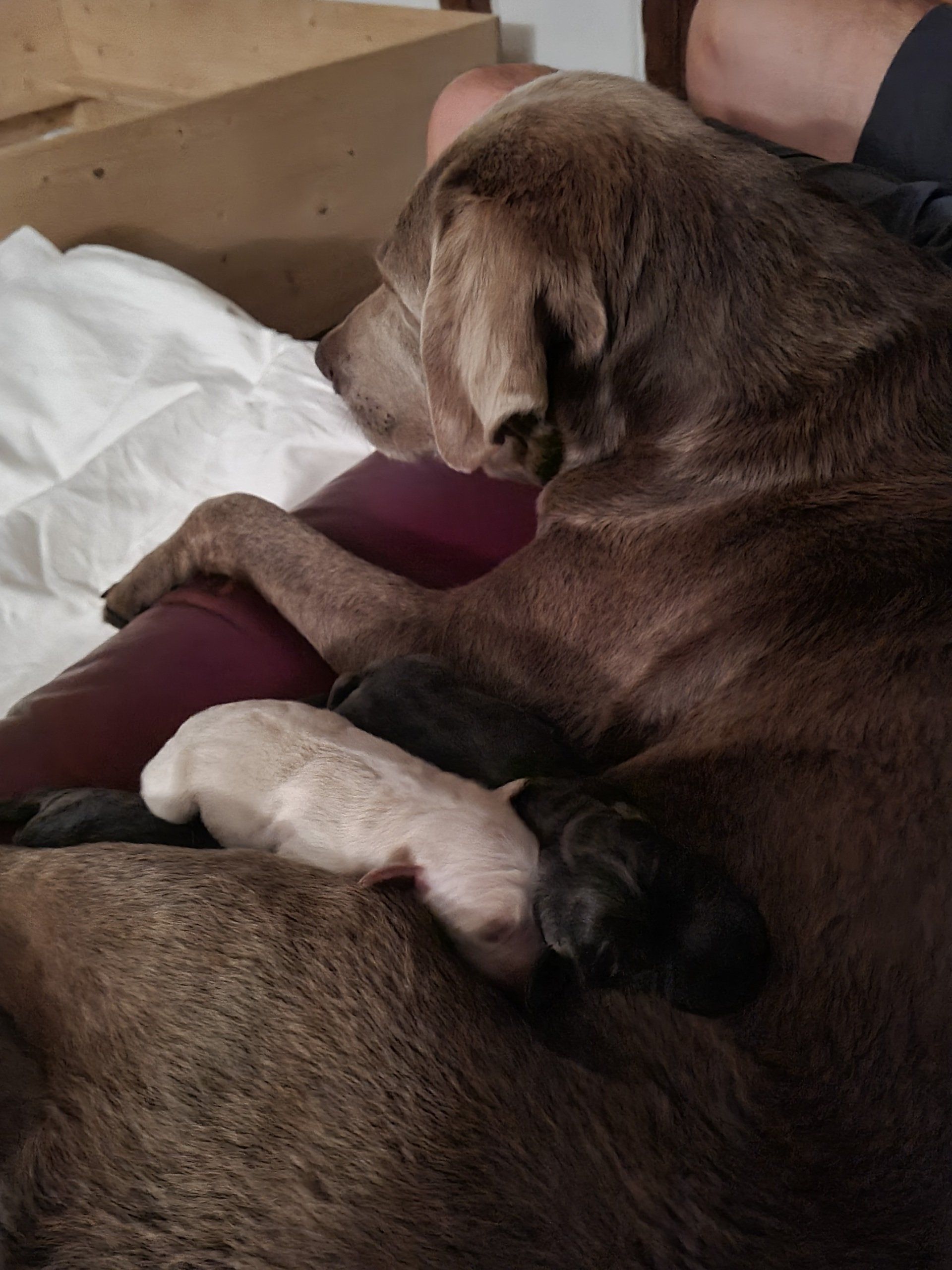 Jedenfalls stand sie am späten Sonntagnachmittag fiepend vor der Schlafzimmertür. Na ja – die Wurfkiste war schon seit ein paar Tagen im Wohnzimmer aufgebaut und es wurde auch schon mehrheitlich probegelegen. Aber nein, das Schlafzimmer musste es sein! Die Tür stand offen, wir gehen kurz zurück in die Küche und ein paar Minuten später kommt sie mit ihrem ersten Welpen im Maul herein -was für eine Überraschung! Die weitere Geburt wurde dann auf dem Ledersofa im Wohnzimmer fortgesetzt. Wozu genau haben wir nochmal die Wurfkiste aufgebaut?