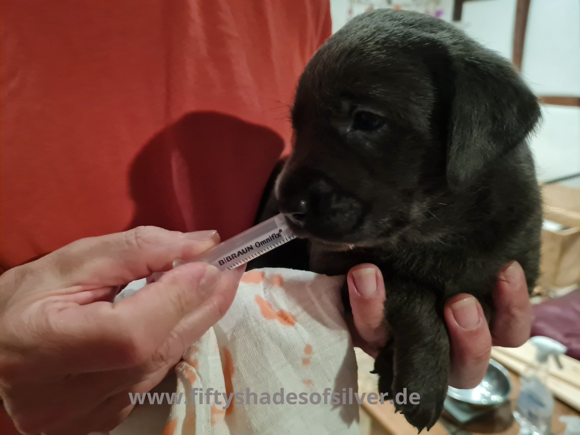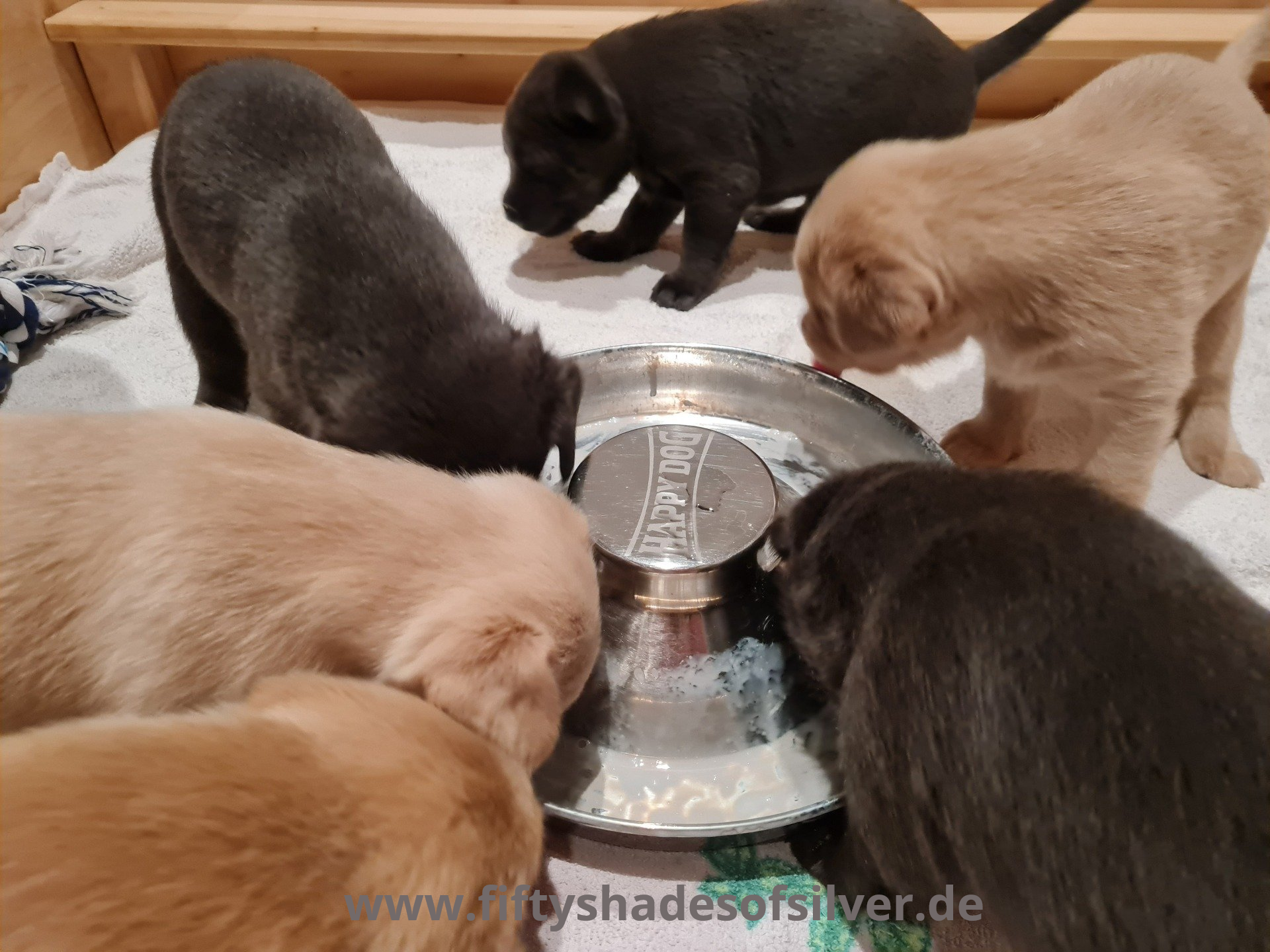 Angefangen haben wir Mitte der Woche mit Ziegenmilch; davon gab es abends als Betthupferl eine kleine Portion für alle. Auch da brauchten die Sechse keine Bedienungsanleitung. Ein untrügliches Zeichen, dass die Welpen (und die Mama) so langsam bereits sind für’s Zufüttern, sind die Zähnchen. Die kleinen Beißerchen haben sich in Nullkommanichts den Weg nach draußen gesucht und dann müssen sie natürlich auch eingesetzt werden. Drei Tage später gab es dann schon etwas Tartar. Alles wird sehr gut von den Kleinen genommen und auch sehr gut vertragen. Das entlastet die Mama und ist der erste Schritt in die Selbstständigkeit.