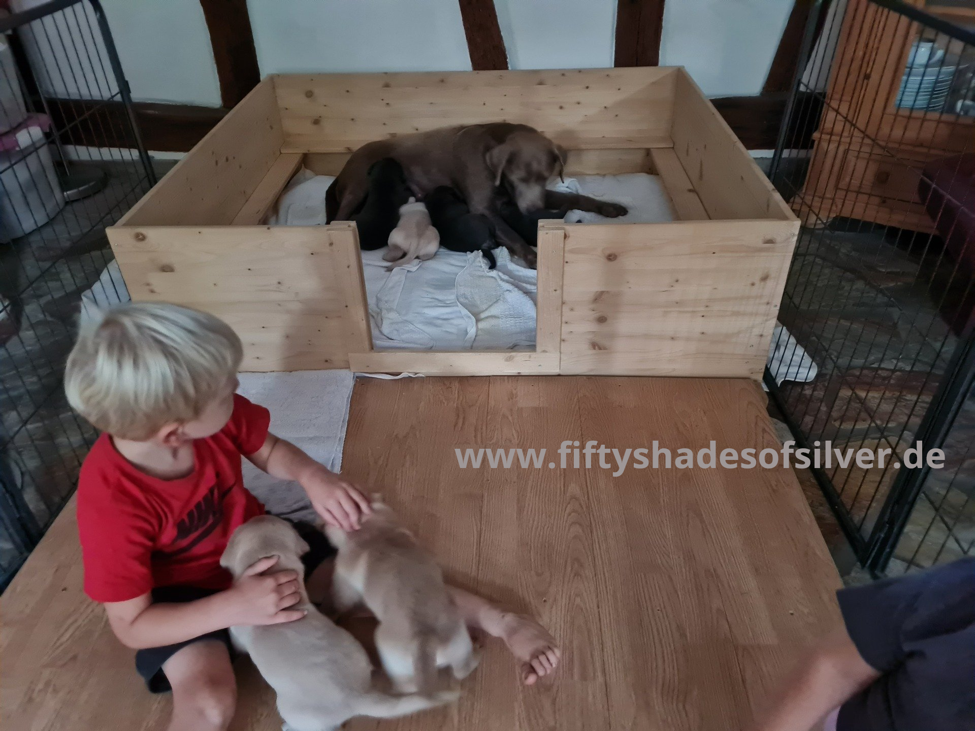 Unsere Welpen werden in ihrer Wurfkiste in unserem Wohnzimmer geboren und wachsen bei uns im Familienverband auf. Sie werden von der Hündin und uns beiden betreut und natürlich hilft auch unser Rüde mit, wo er kann, zum Beispiel beim Abschlecken – eine seiner Lieblingsbeschäftigungen. Auch der große Bruder hilft auf seine Art mit: spielen, raufen und einfach den großen Bruder 'rauskehren! Dadurch dass die Kleinen die ersten Wochen bei uns im Haus verbringen, sind sie alle Geräusche gewöhnt, die in einem Haushalt vorkommen: Staubsauger, Küchenmaschine, Gäste, Hunde, Katzen, Musik, Fernseher und Stille.